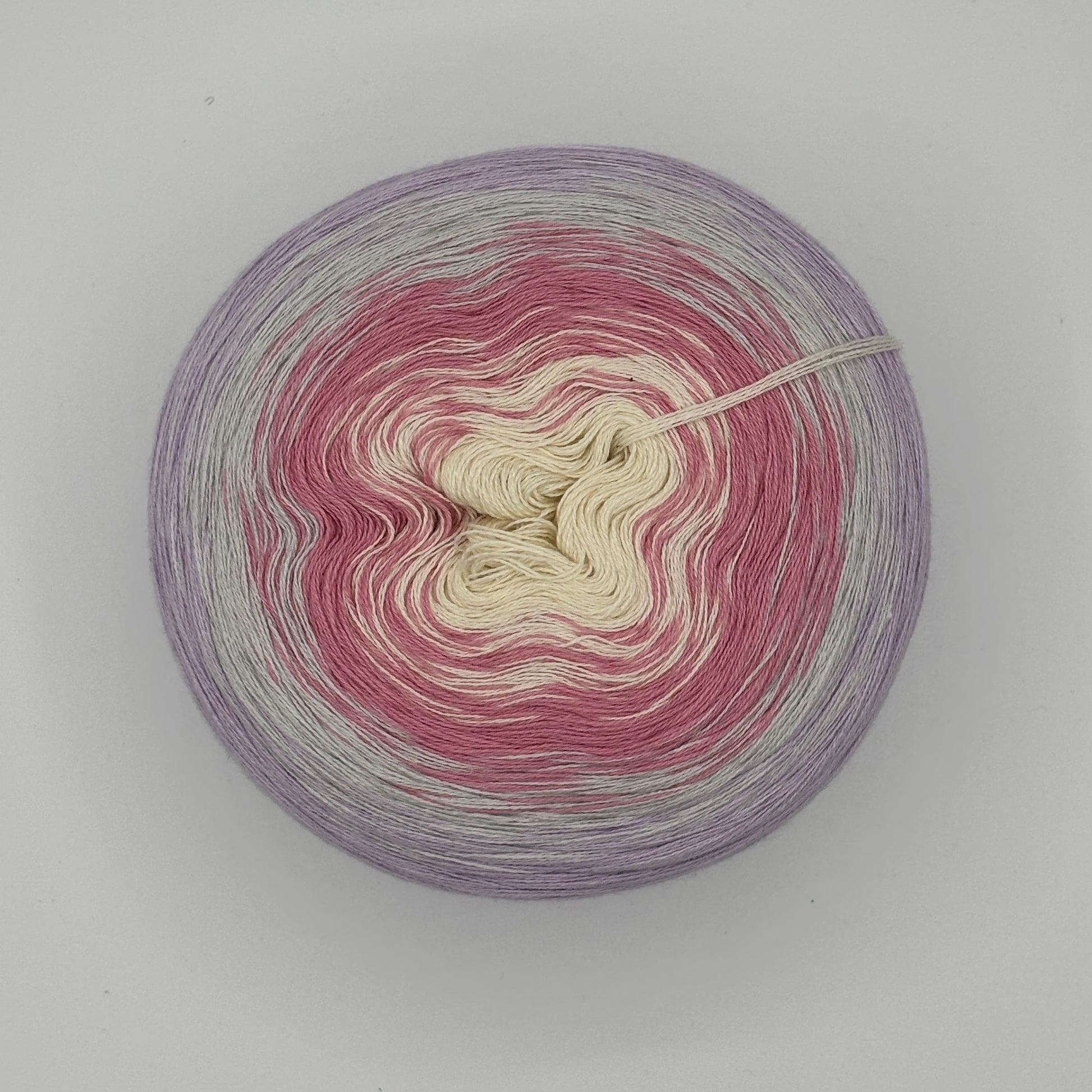 Die parallel liegenden Fäden (nicht verzwirnt) sorgen für ein gleichmäßiges Maschenbild. Farbwechsel erfolgen durch kleine, unauffällige Knoten – für sanfte Übergänge und ein wunderschönes Farbspiel.