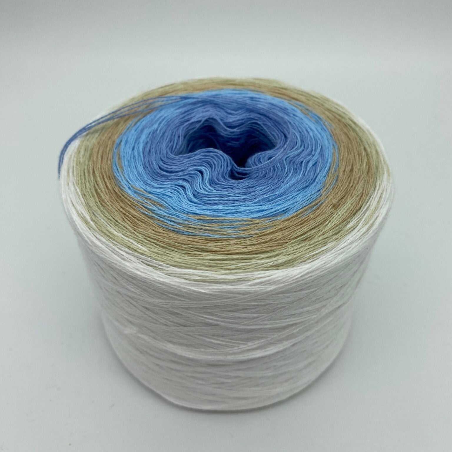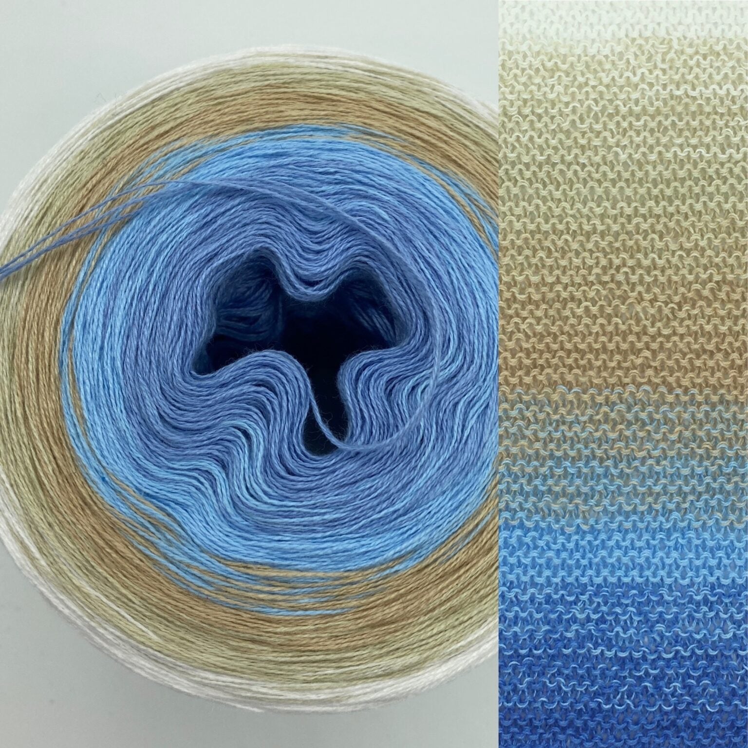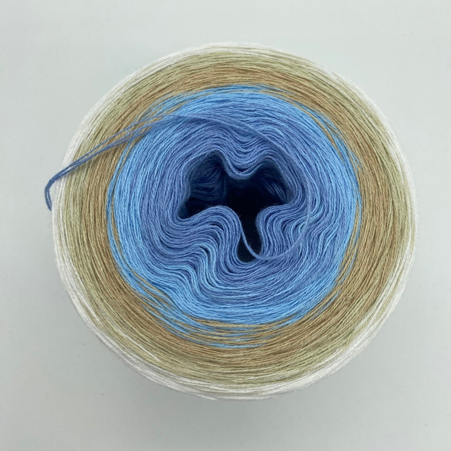 Der Bobbel „Blue Eyes“ fließt harmonisch von Ciel über Aqua, Beige, Hellbeige bis hin zu Weiß – wie der klare Himmel an einem ruhigen Tag, voller Frische und Leichtigkeit. Sanft, beruhigend und einfach wunderschön.