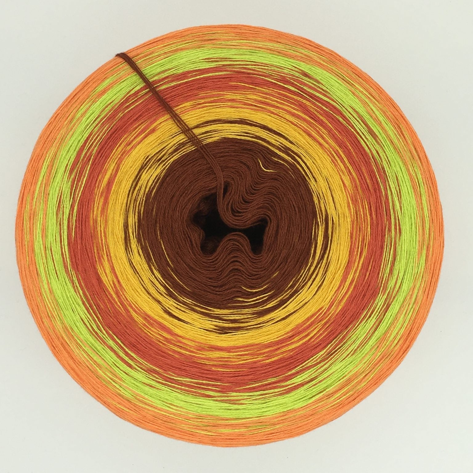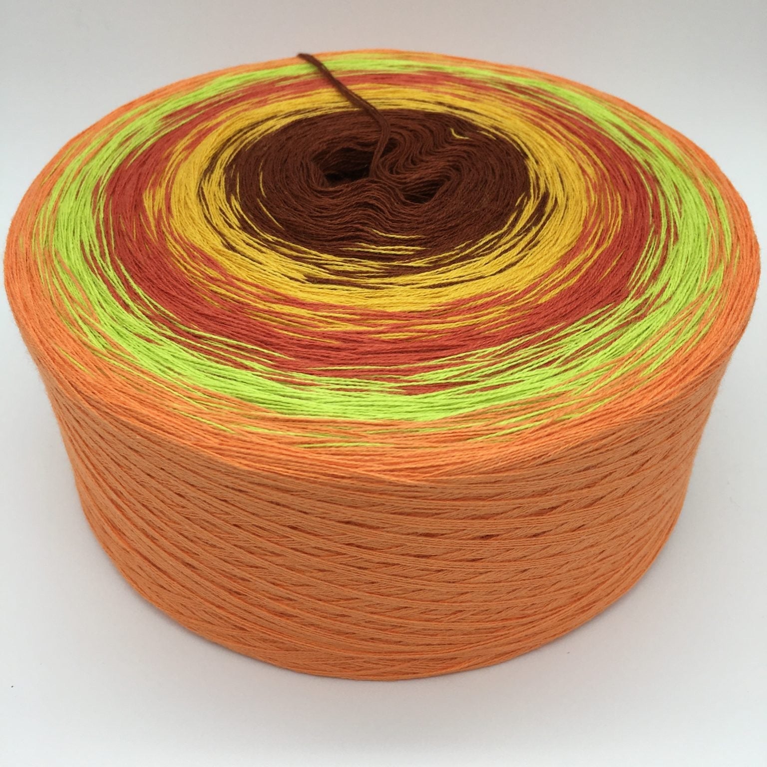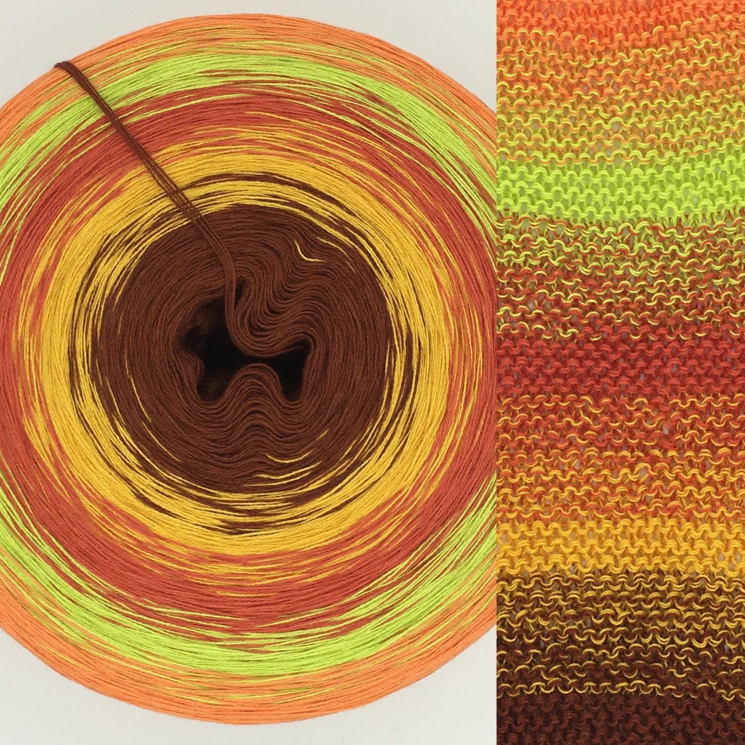 Der Bobbel „Herbstlaub” verläuft von Kastanie über Kurkuma, Rost, Kiwi und endet in einem kräftigen Mango – wie die Farben der Herbstblätter, die in allen Tönen von Gold, Orange und Grün leuchten. Lebendig, warm und voller natürlicher Schönheit.