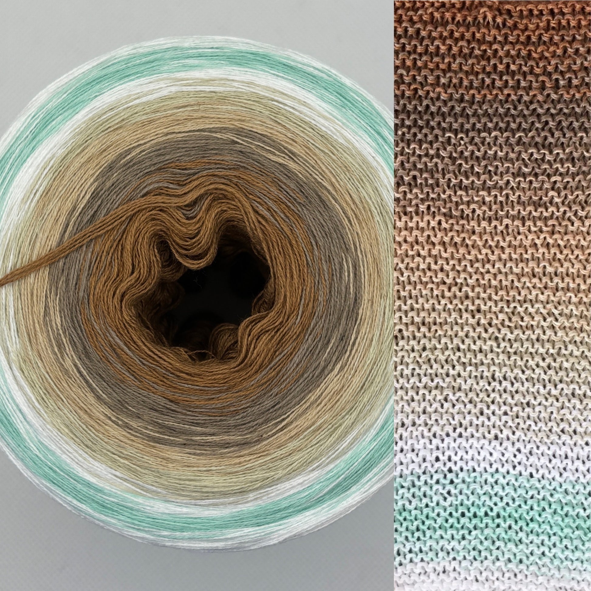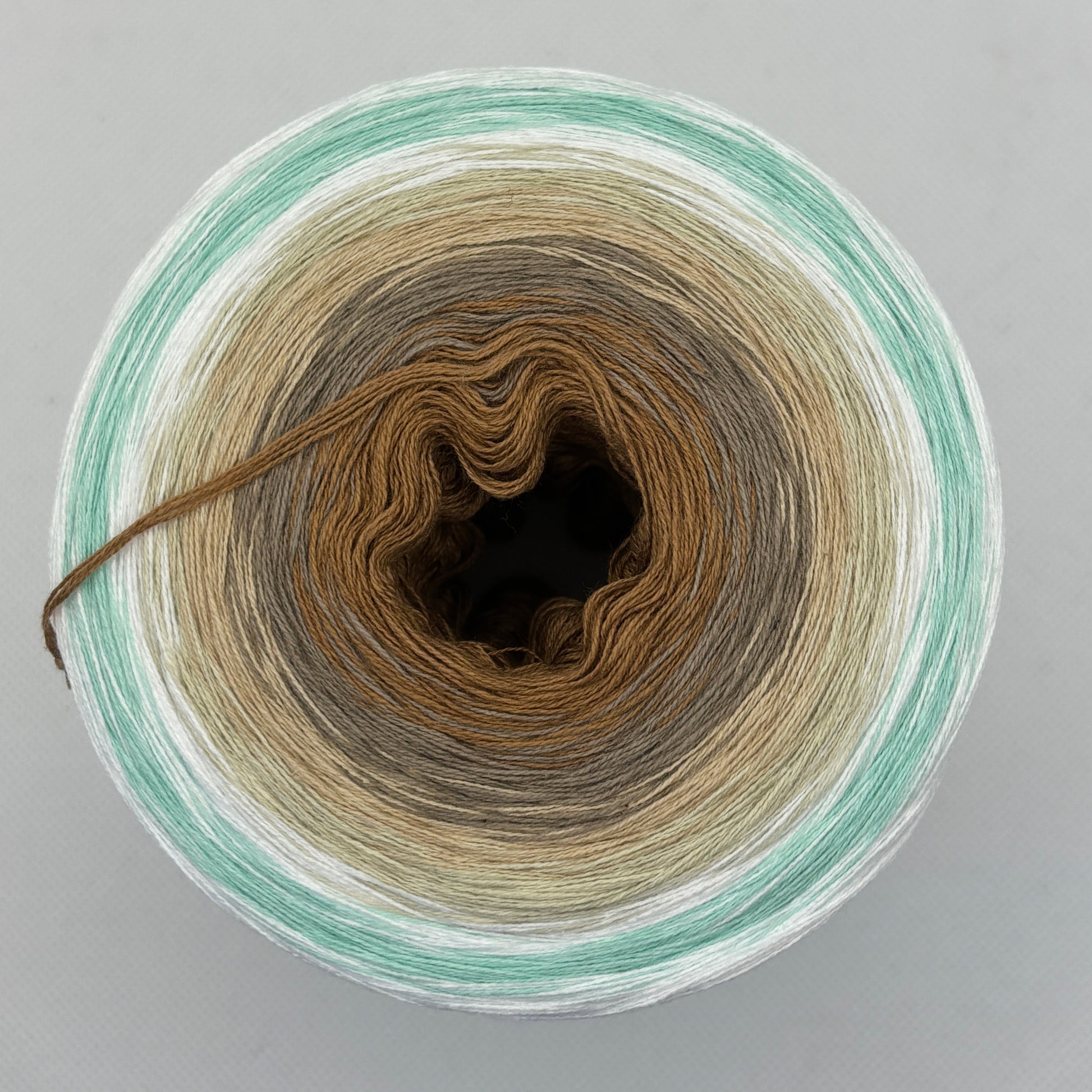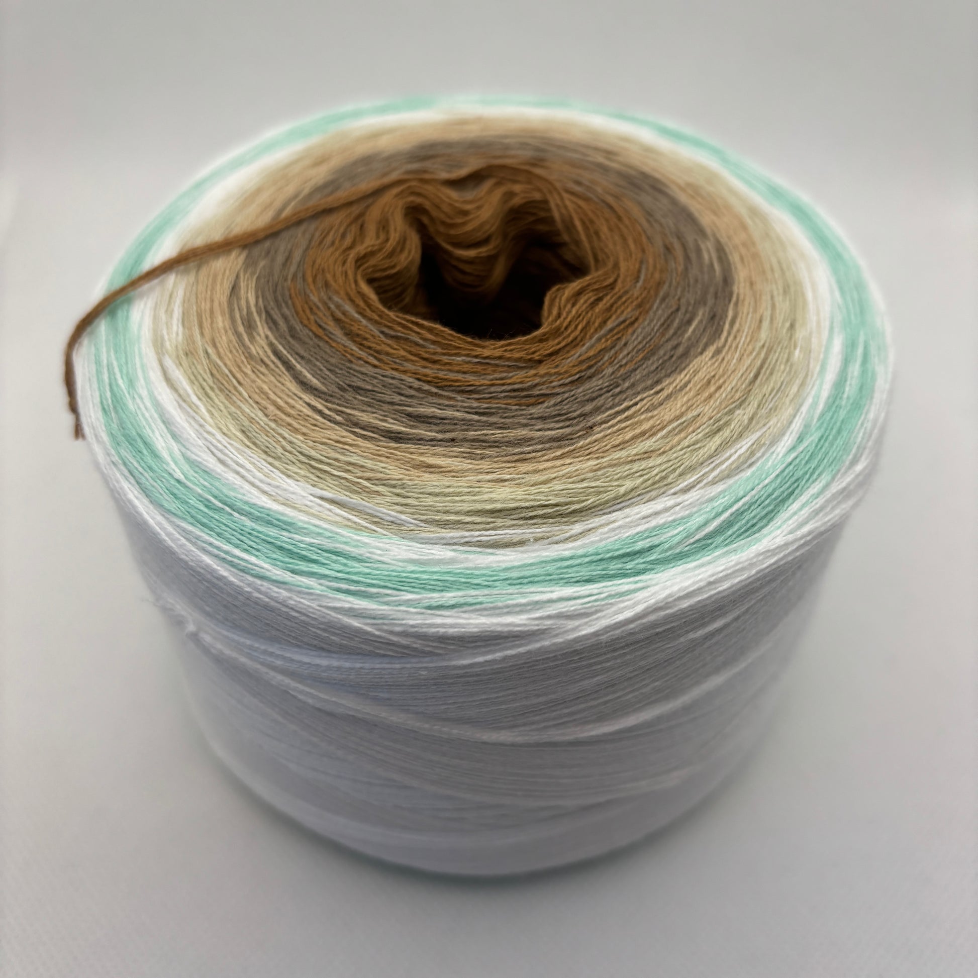 Der Bobbel „Pusteblume“ entfaltet sich in einem sanften Verlauf von Mocca, Schlamm, Beige, Hellbeige, Weiß, einem frischen Pistazie – und endet zart in Weiß. Wie eine fliegende Pusteblume im Sommerwind – luftig, still und voller Poesie.